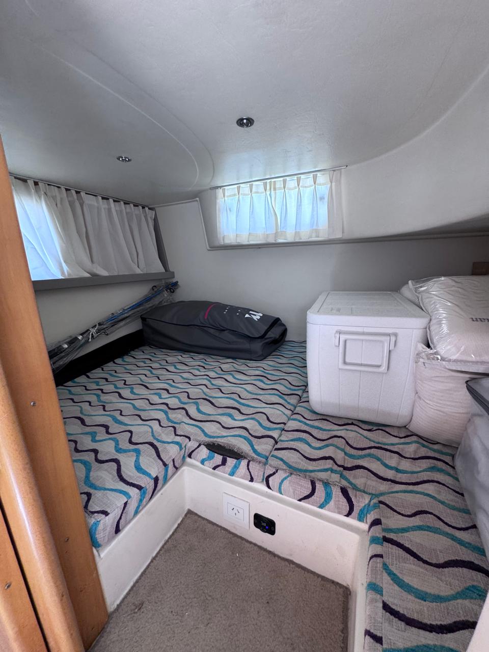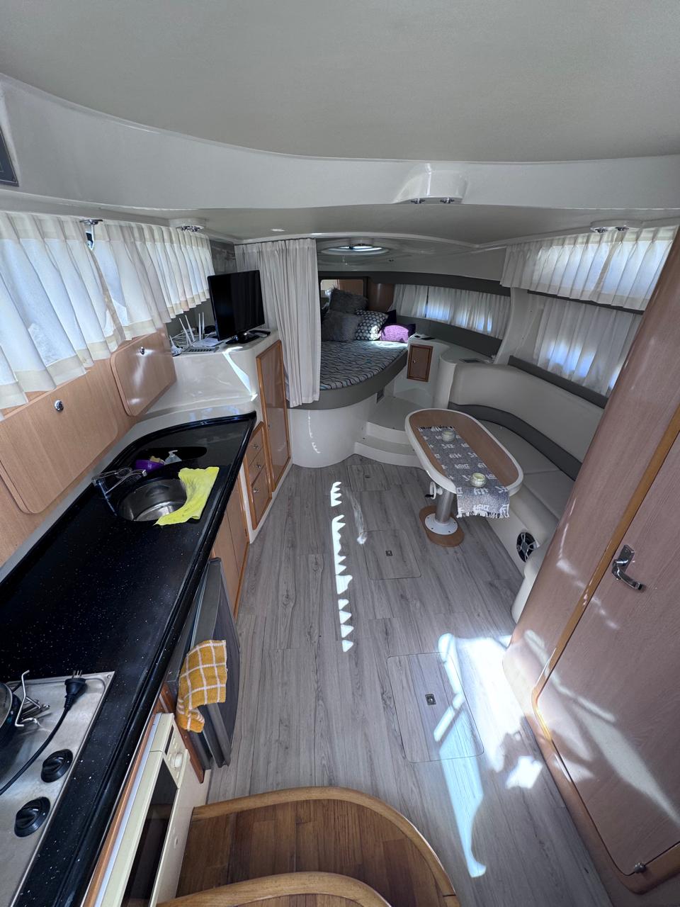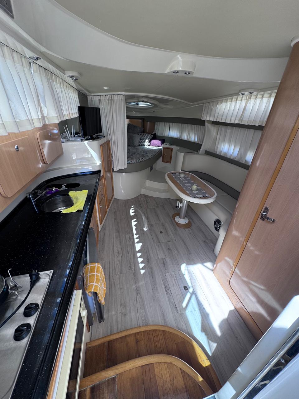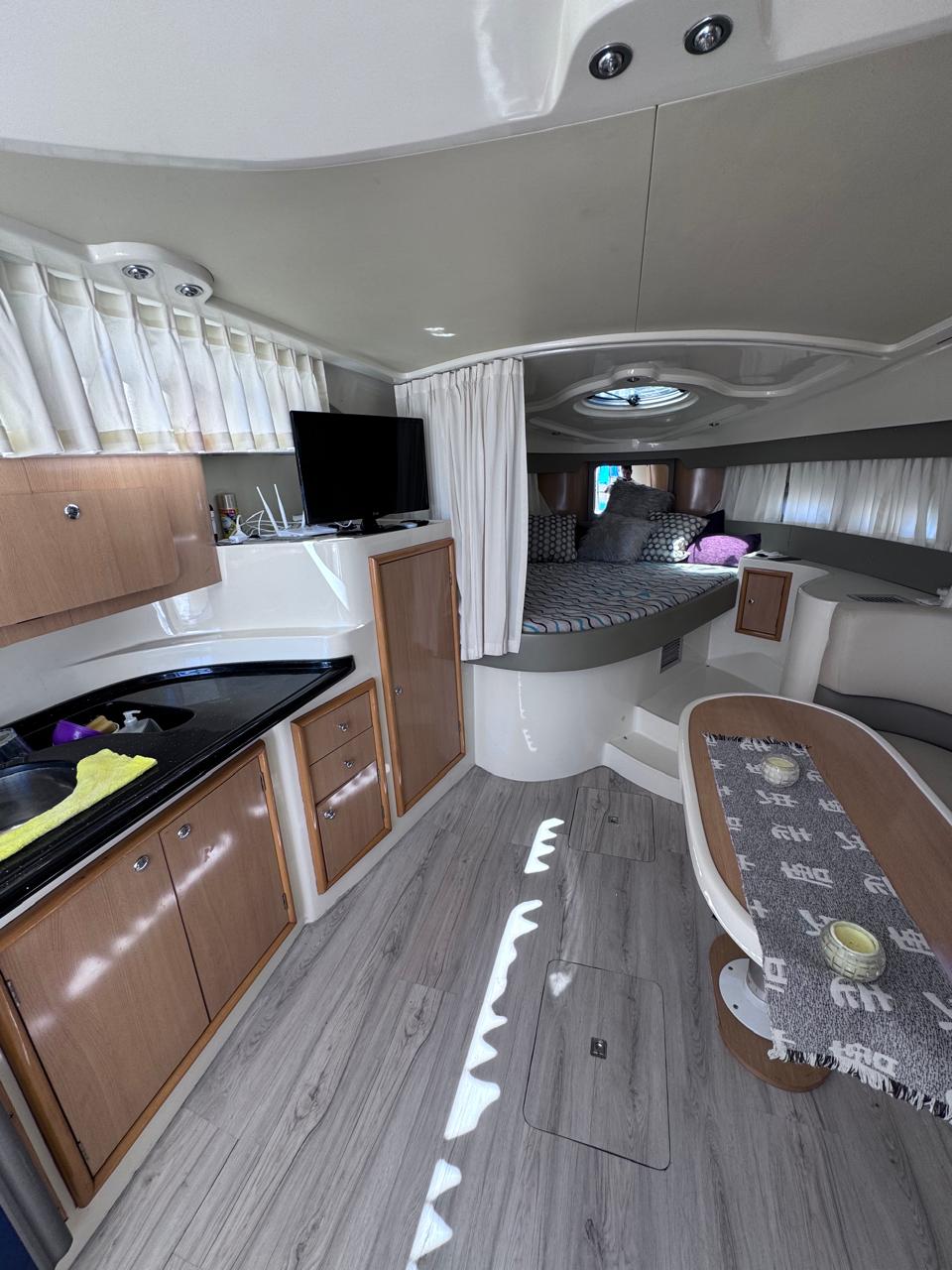 Cama en proa, Conejera en popa, amplio salón dinette, baño completo, cocina completa, amplio cockpit, techo rigido.