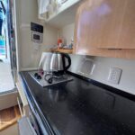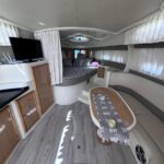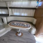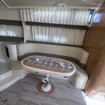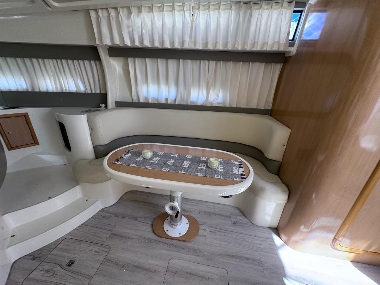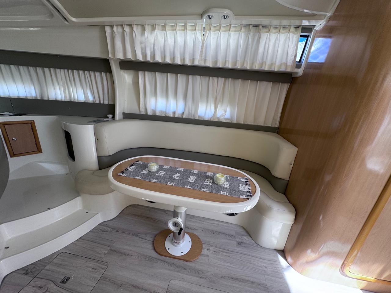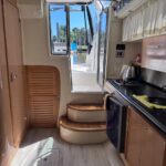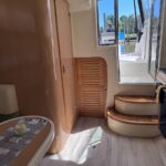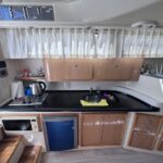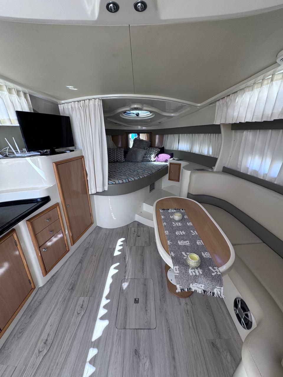 Cama en proa, Conejera en popa, amplio salón dinette, baño completo, cocina completa, amplio cockpit, techo rigido.