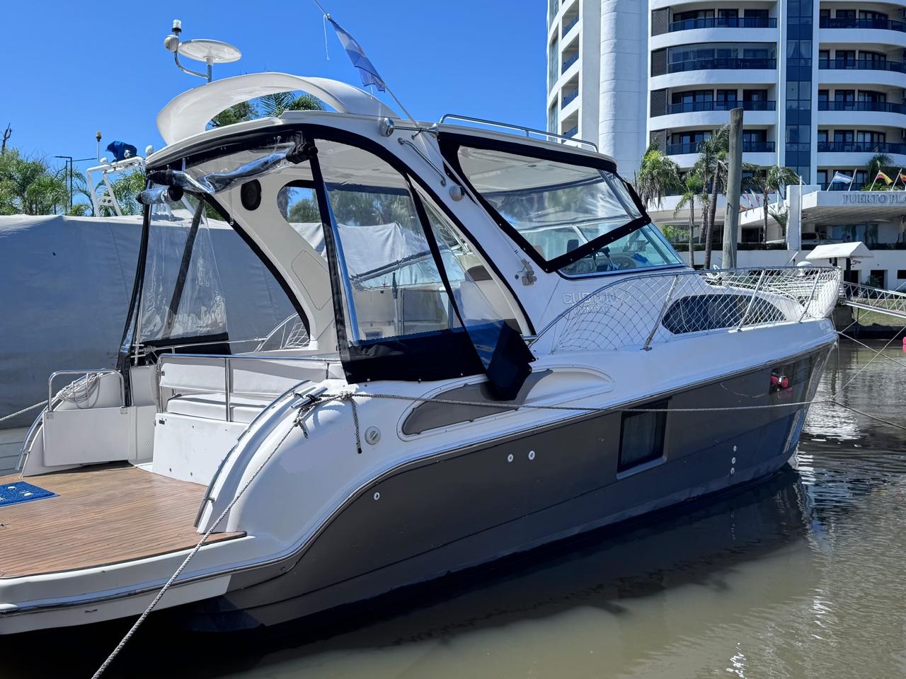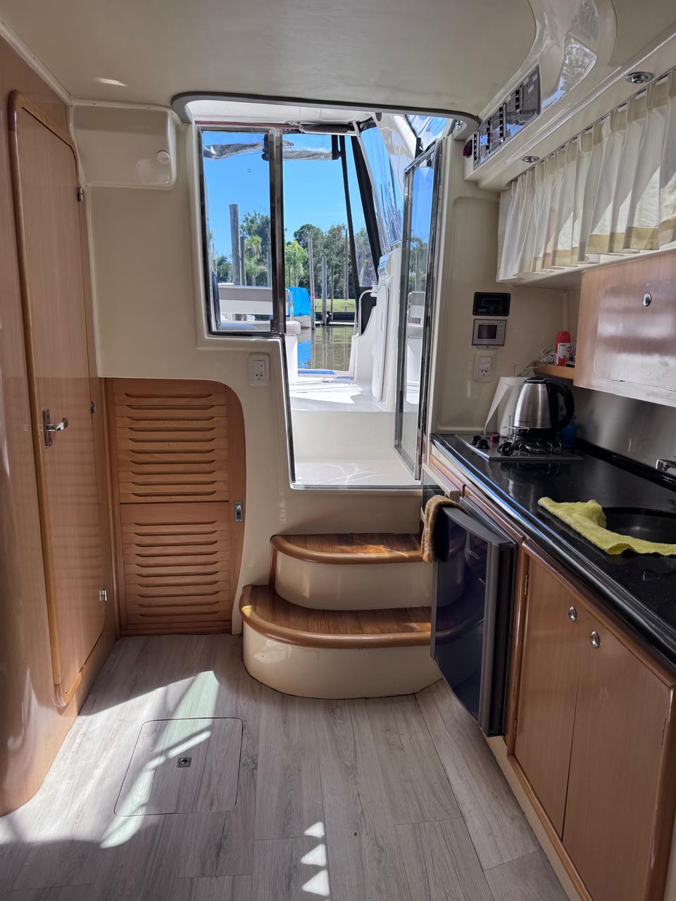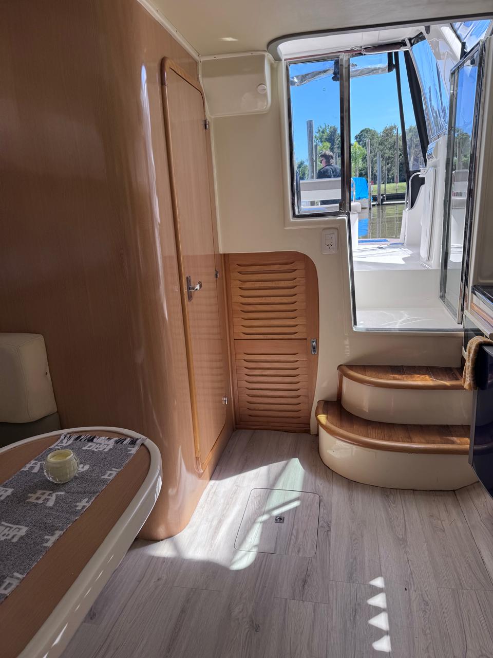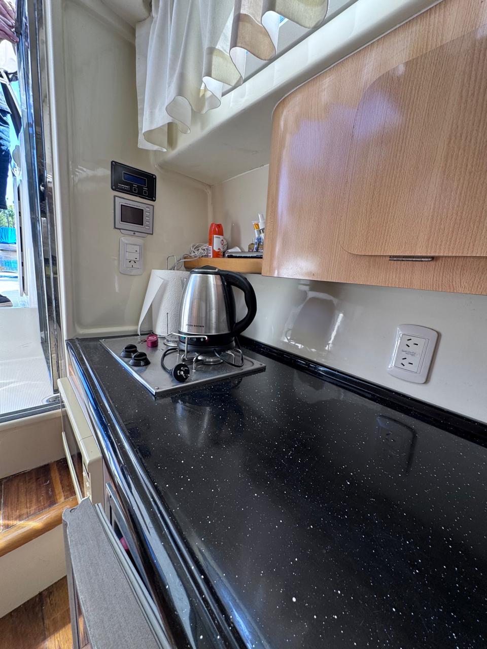 EQUIPAMIENTO: vhf, audio, ecosonda, compás, malacate eléctrico, termo tanque, inodoro eléctrico, duchador en popa y baño, cocina , heladera , faro robotico, cargador de batería, aire acondicionado , microondas, grupo electrogeno.
