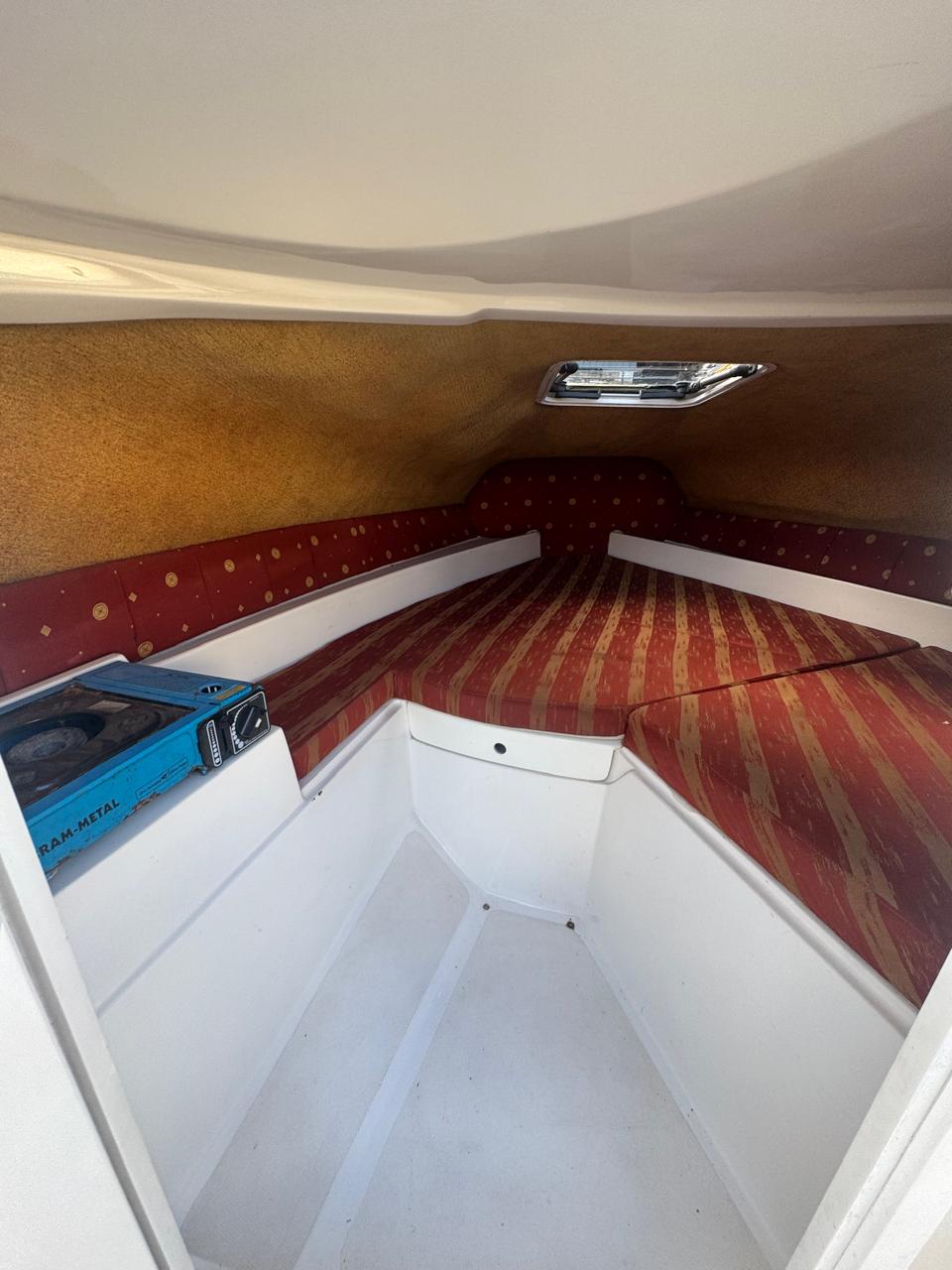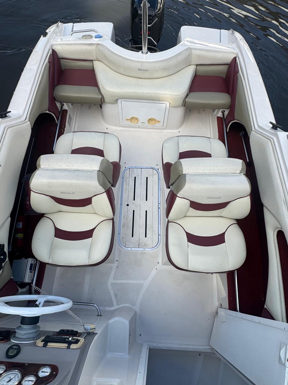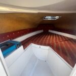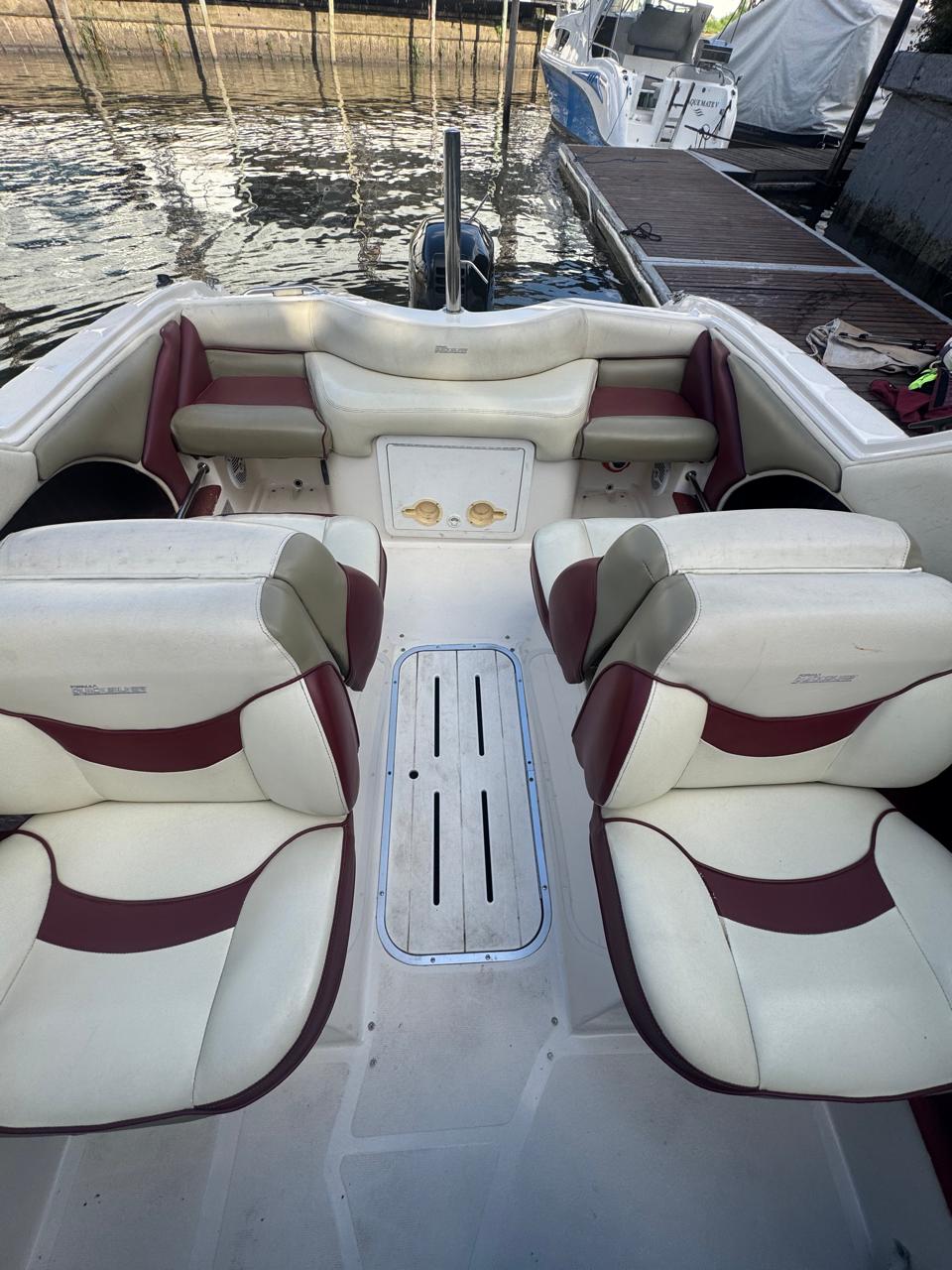 Cockpit con asientos back to back y asientos de popa sobre ambas bandas, estiba grande bajo ambos asientos, planchadas de popa a ambos lados del motor, debajo de las planchadas escalera de popa telescópica y heladera de hielo con drenaje. Barra de esquí.